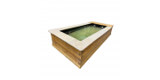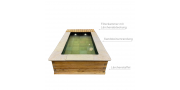 Die Umrandung besteht aus Lärchenholz, das für eine natürliche und langlebige Optik sorgt. Innen wird das Becken mit Vlies und robuster EPDM-Folie ausgekleidet. Der Boden ist zusätzlich mit Sandsteinplatten versehen, was für ein angenehmes Laufgefühl sorgt und den Einsatz eines Poolroboters erleichtert.