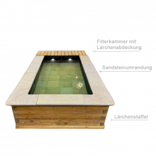 Die gesamte Technik – inklusive Filter und Skimmer – ist in einer separaten, geschickt integrierten Filterkammer unter der Lärchenabdeckung untergebracht. Diese ist leicht zugänglich: Abdeckung öffnen und alle Komponenten sind sofort erreichbar. Der integrierte Wasserfall ist ein fixer Bestandteil der Technik und sorgt für eine ansprechende Optik. Die Beleuchtung schafft zusätzlich ein stimmungsvolles Ambiente. Die Poolumrandung wird mit Sandstein gemacht und rundet das natürliche Gesamtbild perfekt ab.